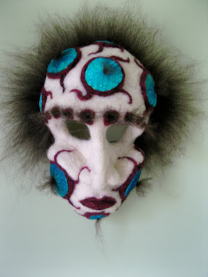 This is the second Spirit Mask work. I've called this one Amiryha and she is a sister to Zharyha. The story is the same. After much consideration, I decided to leave the tails off this one ... I don't find they add much to the work and only serve to lengthen the piece for display purposes. I think she is busy enough without more embellishment. This one has blue sand dollars, dyed in my kitchen sink with vegetable dye. They are very interesting to make once the main mask is shaped. That is where all the work comes into play as it's done over a form I fashioned out of large styrofoam balls. I have some new felting pads coming soon, so I'll make a new form from my two old pads and I think that will make my life easier for the third mask. How many of these I make will depend on sand dollar supply, which is getting dangerously low. Time to hit the beach again. I'll also be searching for small crab shells .. the smaller the better. I'd like to use them on one of these masks as well.